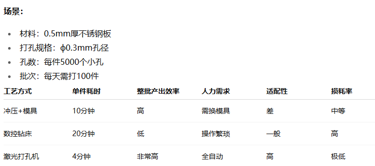 从表中不难看出,在效率、损耗、自动化程度这几个关键指标上,激光打孔机全面胜出。